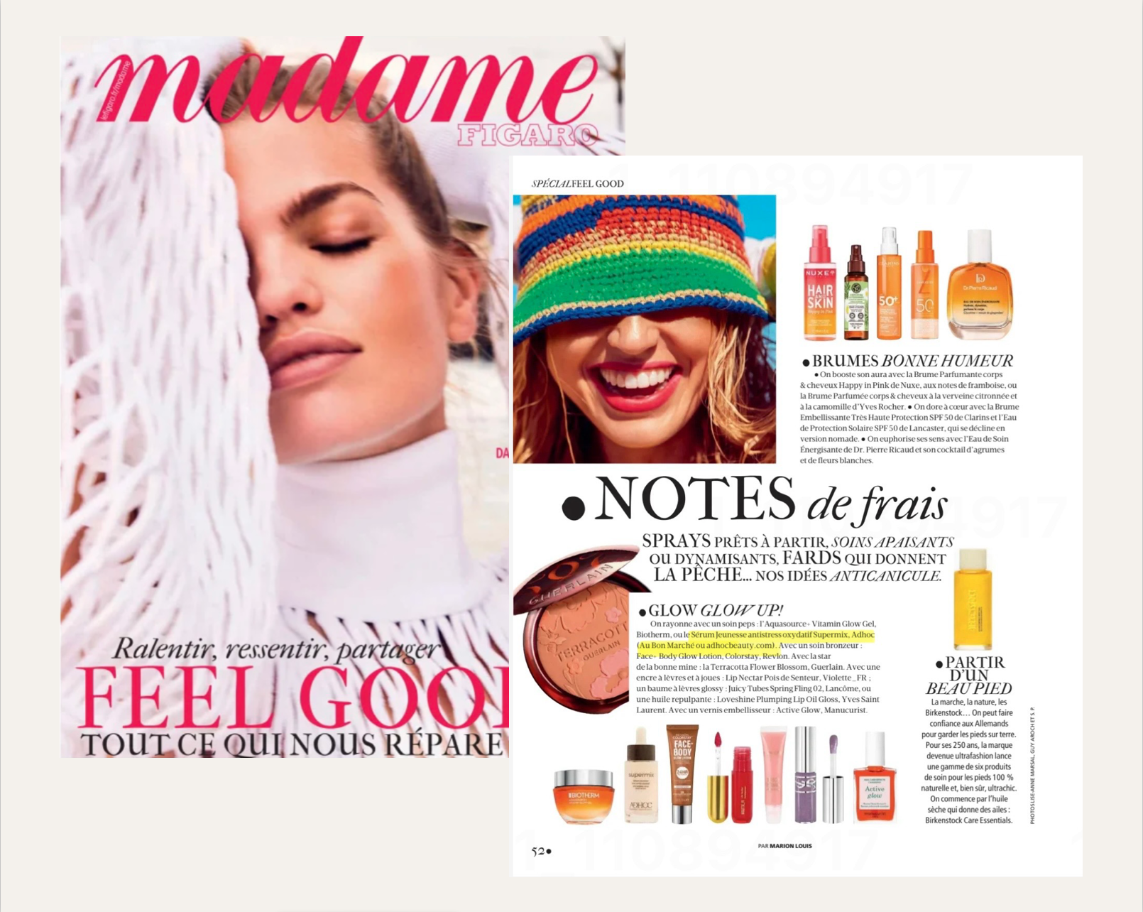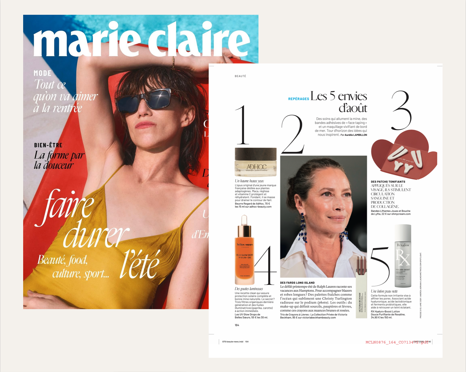 “On rayonne avec un soin peps : (…) le Sérum Jeunesse antistress oxydatif Supermix, AdHoc Beauty.” Madame Figaro, 18 juillet 2025 Le beurre regard, “un baume beaux yeux. L’opus original d’une jeune marque française dédiée aux plantes adaptogènes.” Marie-Claire, Août 2025